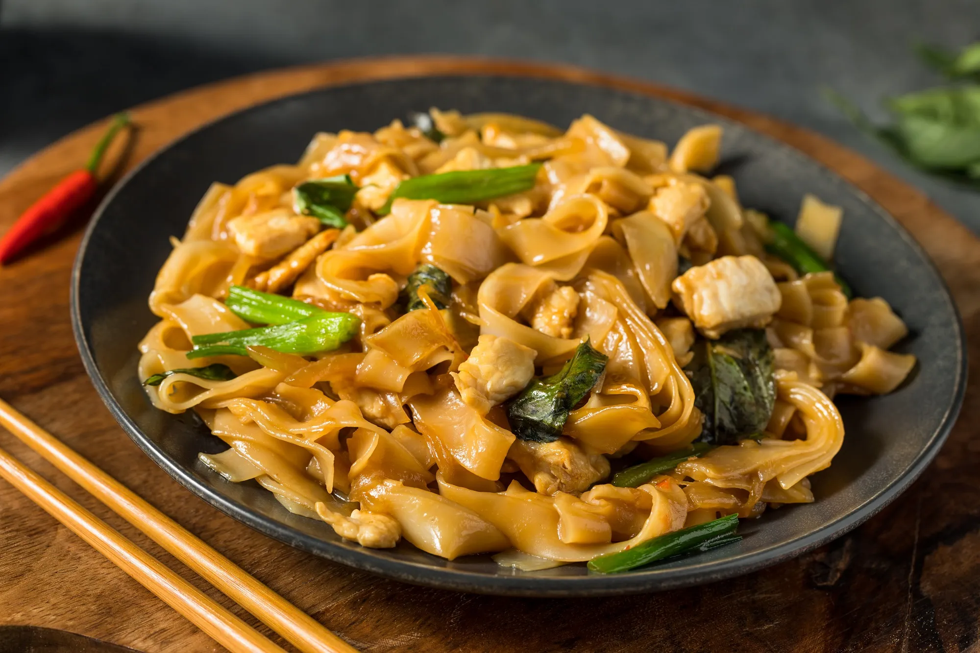 Wide Rice Noodles Stir-Fried With Chicken, Bell Peppers, Onions, And Fresh Basil In A Savory Sauce.
